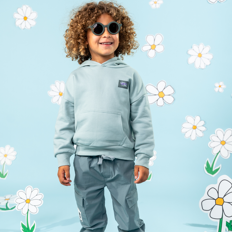 Een taupekleurige broek met zakken in voor- en achterkant. Elastische tailleband met koord.