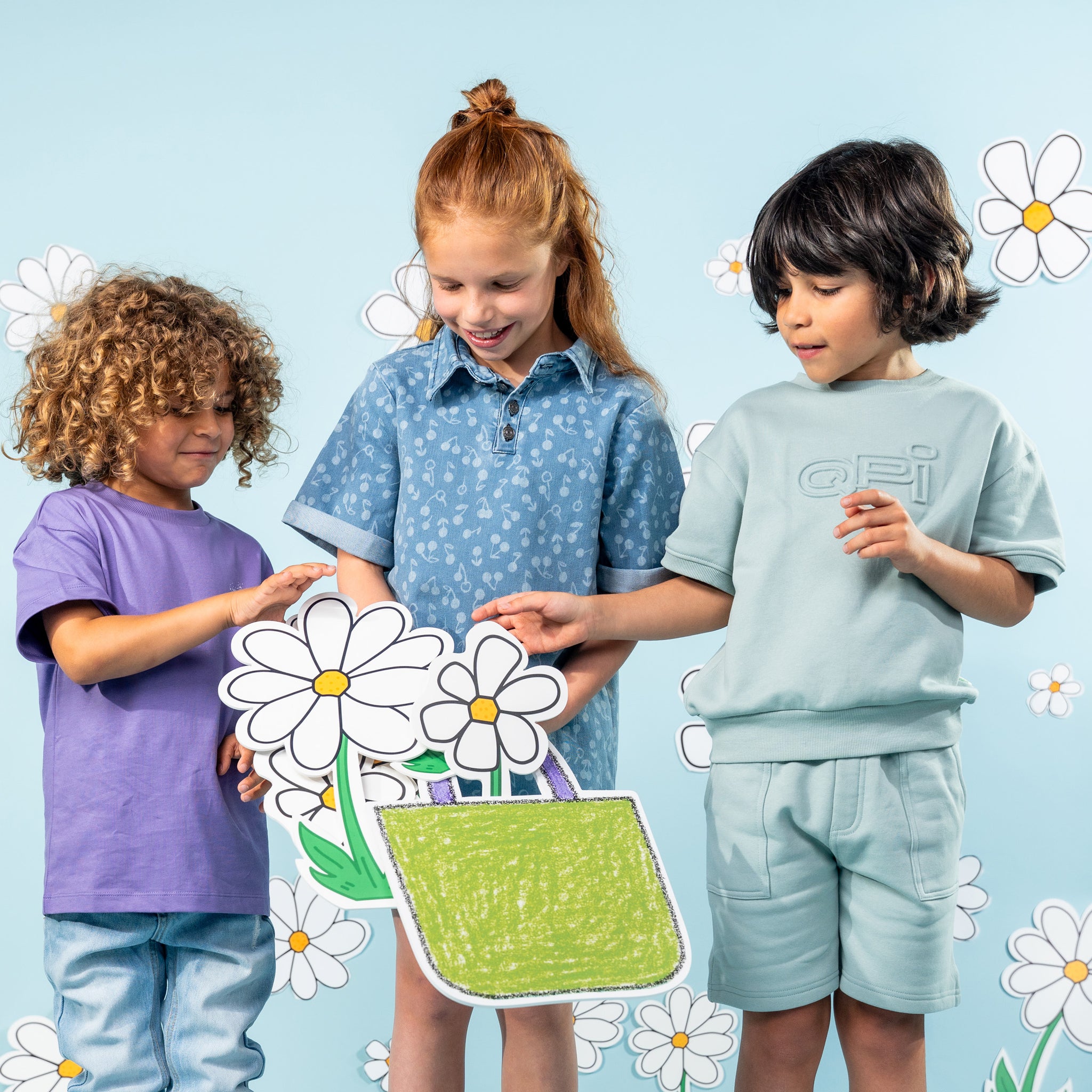 Een petrolkleurig poloshirt met een geprinte tekst op het voorpand, Korte mouwen.